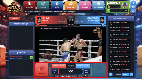 จากนั้นกดยืนยันการเดิมพัน ผู้ใช้งานทุกท่านสามารถที่จะเลือกเดิมพันมวยพักยกได้หลากหลายคู่และสามารถดูประวัติการเดิมพันได้