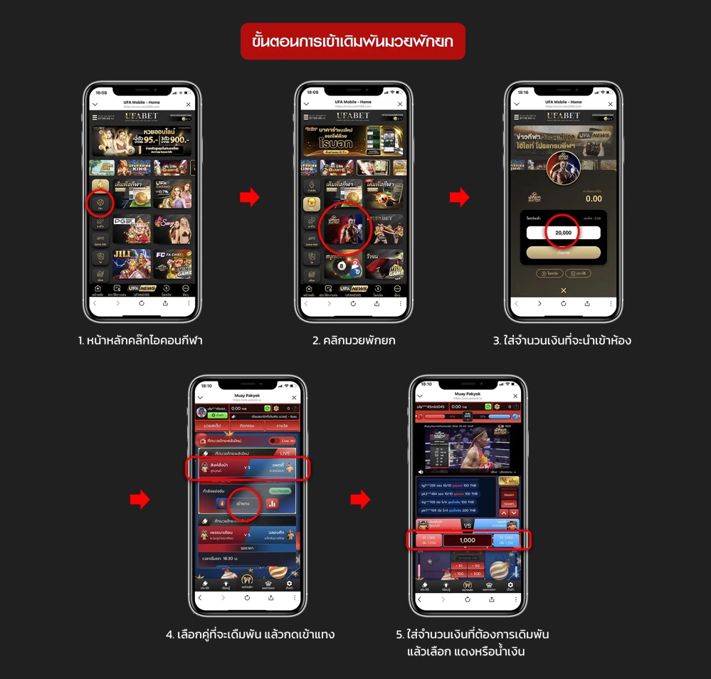 ขั้นตอนในการเข้าเดิมพัน มวยสเต็ปและมวยพักยก ซึ่งจะเป็นวิธีการเดิมพันที่มีขั้นตอนที่ไม่ซับซ้อน ซึ่งจะแบ่งเป็นเพียง 5 ขั้นตอน ให้ผู้ใช้งานทุกท่านนั้นสามารถที่จะทำความเข้าใจและสามารถที่จะเข้าเดิมพันมวยสเต็ปและมวยพักยกได้อย่างง่ายดาย มีเงินเพียงแค่หลักสิบ ก็สามารถที่จะทำกำไร จากการเดิมพันมวยได้แล้ว ทั้งนี้ยังสามารถดูมวยออนไลน์แบบสดๆ Real Time ผ่านทางหน้าเว็บไซต์ได้อีกด้วย